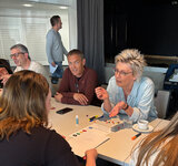 Um die ersichtliche Aufregung aller aufzulösen, starteten wir mit einer musikalischen Einlage verbunden mit der Einladung, sich gemeinsam mit uns zu bewegen. Schnell waren alle Akteure in der Mitte des Raumes tänzerisch versammelt und die Aufregung löste sich sichtlich in Lachen und individuelle Einlagen. Womit ließe sich das besser gestalten, als mit einer Art „Speeddating“. Die jungen Menschen hatten so die Möglichkeit breitgefächerte Fragen zu stellen und das mit einer zeitlichen Grenze von 5 Minuten pro Runde. Um den Student:innen eine Unterstützung in Sachen Fragestellungen an die Hand zu geben, projizierten wir die Internetseite „5 schnelle Fragen“ (angelehnt an den Podcast „gemischtes Hack) an die Wand. Dabei hatten aber nur die Student:innen die Sicht darauf. Wo anfangs die Sorge ersichtlich war, dass 5 Minuten sehr lange erscheinen, zeigte sich das diese sehr schnell vorbeigingen - jede:r Student:in sprach so mit jeder Führungskraft.