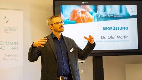 Am 15. April 2026 eröffnete die Wirtschaftsakademie Nord der Diakoniewerk Greifswald gGmbH ein neues Simulationszentrum an der Gesundheits- und Pflegeschule Greifswald – ein Ort, der Pflegeausbildung erlebbar und praxisnah macht. Rund 40 geladene Gäste aus Pflegeeinrichtungen Greifswalds und der Region waren dabei, als Dr. Olaf Martin (Bereichsgeschäftsführer der Wirtschaftsakademie Nord) und Marlen Kästner (Leitung der Gesundheits- und Pflegeschule) das Zentrum offiziell in Betrieb nahmen.