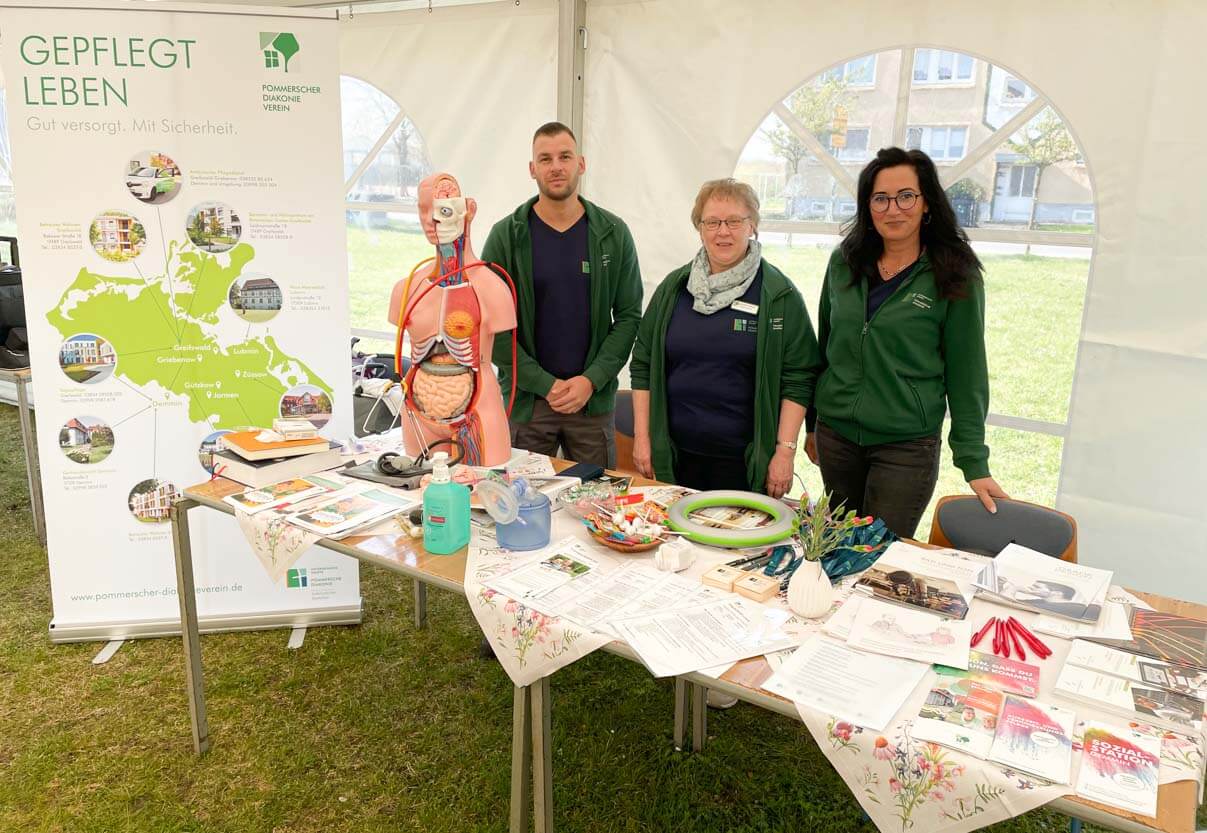 Am Sonnabend, den 22. April 2023, lud die Hansestadt Demmin zum zweiten Mal zur regionalen Berufs- und Ausbildungsmesse „Stellenflut“ auf die Wiese am Demminer Marktplatz ein. Unternehmen aus der Region hatten die Möglichkeit, sich öffentlichkeitswirksam zu präsentieren und ihre freien Stellen zu bewerben. In diesem Jahr nahmen auch Vertreter:innen der Unternehmensgruppe Pommersche Diakonie teil. Die Zentralen Praxisanleiter:innen, Frau Kathrin Boldt und Herr Christoph Küthe, sowie die Regionalleitung der Region Demmin aus dem Geschäftsbereich pflegen, Frau Birgitt Küthe, standen allen Interessierten Rede und Antwort.