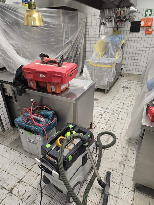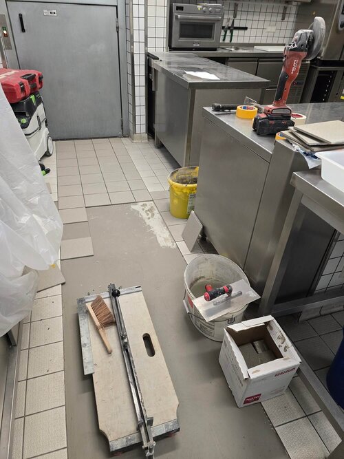 Fun-Fact: Fliesenmeister Herr Rusch von Fa. NOBA SFB GmbH war auch derjenige, der 2004 im Eröffnungsjahr die Fliesen in der Küche verlegte. Tja, den Täter zieht es halt immer an den Tatort zurück. Herzlichen Dank an eine saubere und schnelle Arbeit. Und großes Lob an Küche und Service: Ihr habt eine ungewöhnliche Situation meisterhaft bewältigt.
