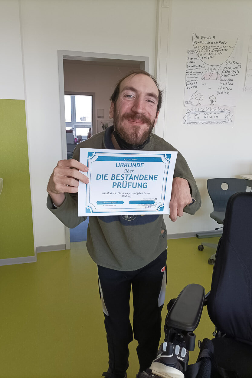 Im Mai letzten Jahres bewarb sich Herr Siepert, Mitarbeiter der Greifenwerkstatt, bei einem inklusiven Projekt an der Hochschule Neubrandenburg mit dem Ziel einer 3-jährigen Qualifizierung zur Bildungsfachkraft. Nach einem Vorstellungsgespräch in Neubrandenburg erhielt er eine positive Rückmeldung und freute sich sehr über diese einmalige Chance. Er wurde unter 20 Bewerbungen als einer von 6 Teilnehmenden ausgewählt. Herr Siepert setzte all seine Freude und die Aufbruchstimmung mit Unterstützung der Fachkräfte vom Dienst zur betrieblichen Inklusion der Greifenwerkstatt in Tatendrang um. Anfang August zog er bereits nach Neubrandenburg und wenige Wochen später, am 15. September, ging die Ausbildung los. Seit September fährt Herr Siepert selbstständig mit seinem Rollstuhl zur Hochschule und nimmt an den täglichen Bildungseinheiten teil.