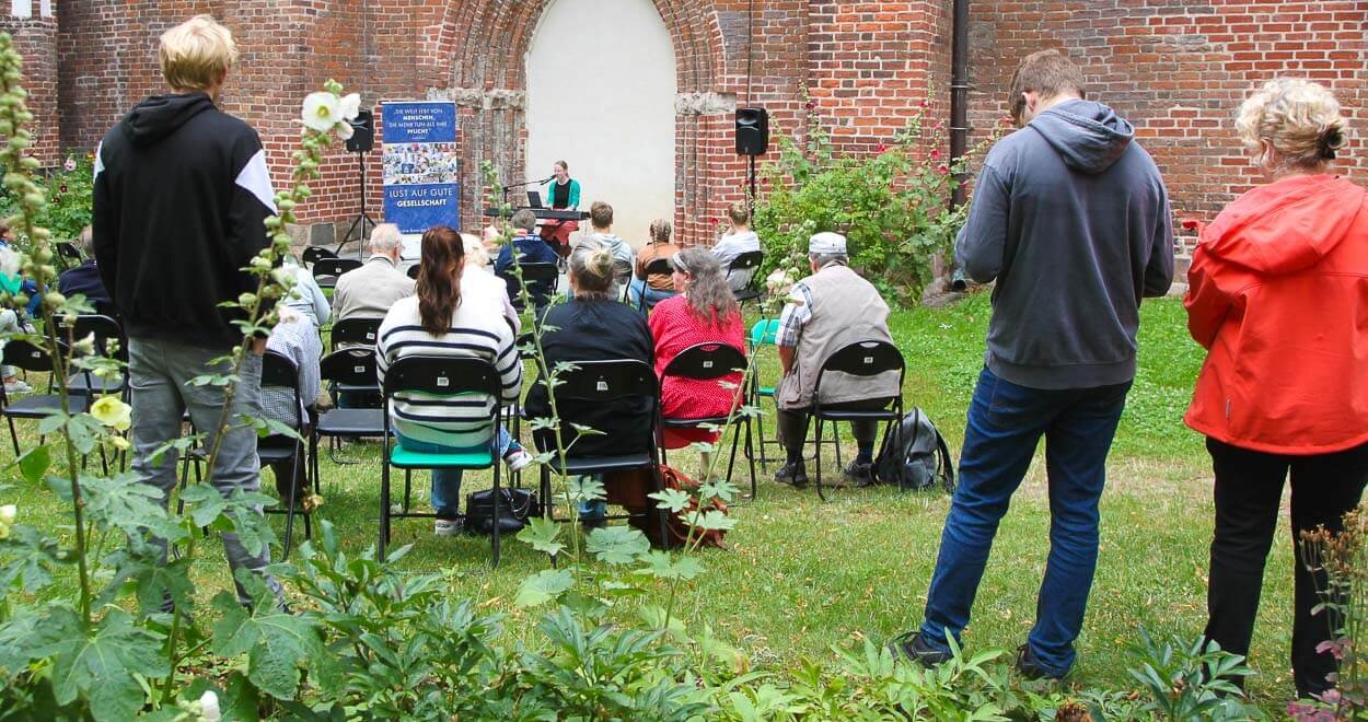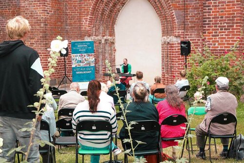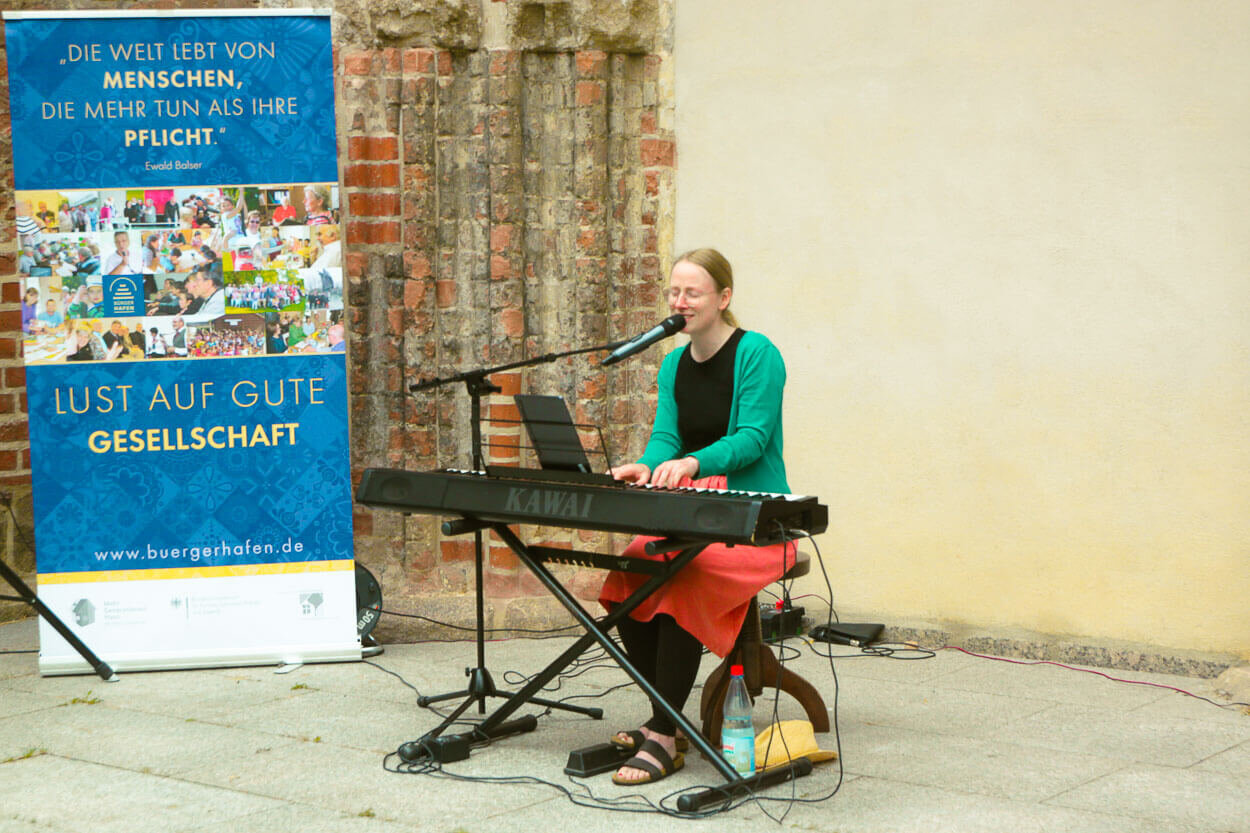 Mit Sorge schauten die Organisator:innen des Bürgerhafen Greifswald am 22. Juli auf die heranziehenden dunklen Wolken, die durch den Wind immer näher rückten. Sie ließen ahnen, dass der Nachmittag, an dem das Benefizkonzert stattfinden sollte, nass und windig werden könnte. Aber wie ein Wunder zog der Regen (abgesehen von ein paar Tropfen) vorbei, ein wundervolles Buffet konnte dank vieler ehrenamtlicher Unterstützer:innen aufgebaut werden und die Technik wurde von vor Nässe schützenden Plastiktüten befreit.