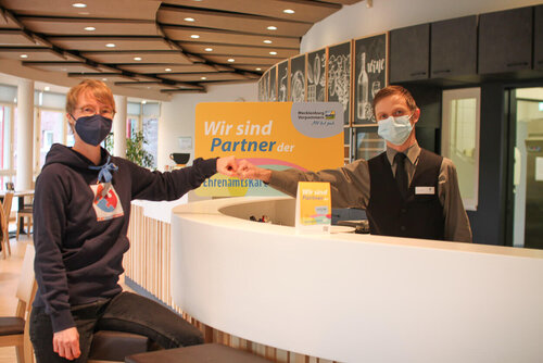 Empfangen wurde sie im Ausbildungscafé des Unternehmens, in dem junge Menschen mit unterschiedlichen und komplexen Behinderungen eine Ausbildung im Bereich Gastronomie absolvieren. Patrick Schicka als Teamleiter des Tagungszentrums und der Cafeteria nahm stellvertretend für das gesamte Team das Partnerpaket mit verschiedenen Werbematerialien entgegen, die auf die Vorteile für Besitzer der Ehrenamtskarte aufmerksam machen sollen. Sie erhalten nämlich ab diesem Jahr 20 % Rabatt auf Angebote in der Ausbildungscafeteria.