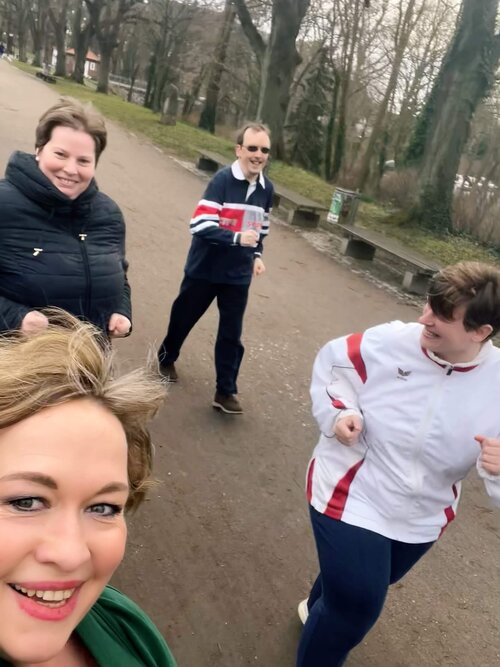 Mittwochs treffen sich um die 5 Personen um bei besten Umfeldbedingungen in Form und Schwung zu kommen. Gemütlich geht es noch bis zur ersten Station am Baum und dann beginnen wir an der alten Eiche mit einer Erwärmung. Jeder, wie er kann und am wichtigsten ist, immer die Freude und der Spaß miteinander. Vorwärts, rückwärts laufen wir über den wunderschönen Stadtwall über Brücken, im Slalom um die Bäume, steigen Treppen hoch und runter und wieder hoch und wieder runter (wir haben mit einem Augenzwinkern immer hier und da was vergessen, wonach wir oben und unten nochmal gucken und suchen müssen). Auf dem Rückweg fahren wir den Puls langsam runter in den cool down und dehnen die Muskeln und Sehnen. Zum Schluss steigt, wer noch kann, die Bordsteinkante hoch und runter und zusammen atmen wir im Kreis die gute Luft ein und drücken symbolisch den Stress mit aller Energie und Kraft weg. Beim Abklatschen frage ich, wer nächste Woche wiederkommt - alle! Bis dahin!