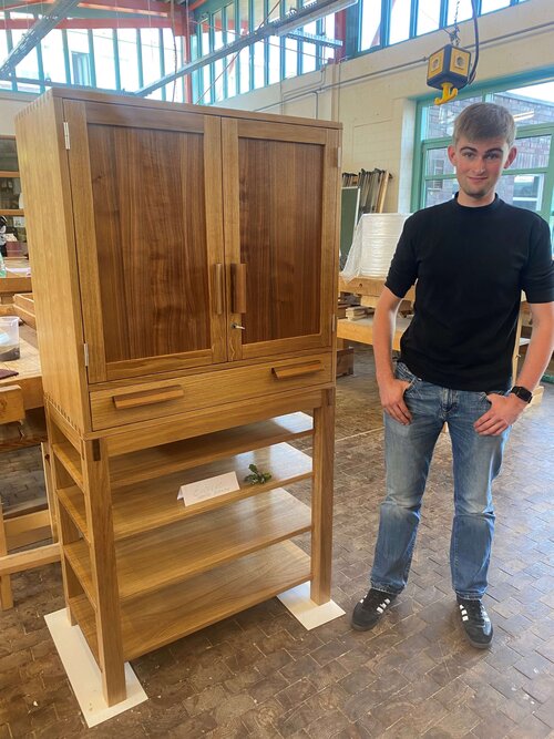 Genau 100 Stunden hatten die Jugendlichen Zeit, ihr Gesellenstück in der Ausbildungshalle fertigzustellen. Zuvor galt es, Ideen zu sammeln und eine selbst erstellte Zeichnung bei der Prüfungskommission einzureichen. Das Prüfungsstück musste über ein Schubfach, ein Drehteil und über klassische Holzverbindungen verfügen. Gefragt waren neben der handwerklichen Arbeit natürlich auch Funktionalität und Kreativität. Zu den überaus gelungenen Möbelstücken der Auszubildenden gehörten zwei Couchtische, ein Schrank und ein Schreibpult, die bis vor Kurzem in der Halle besichtigt werden konnten.