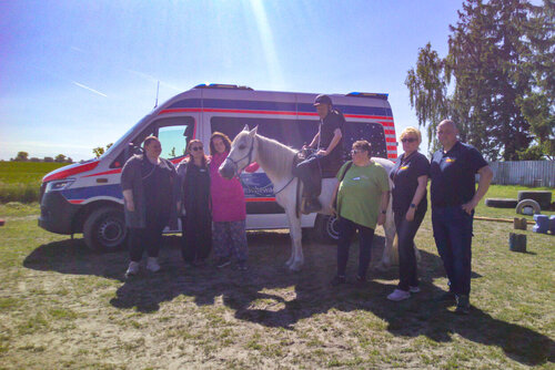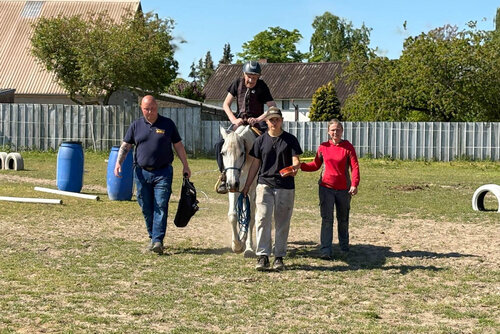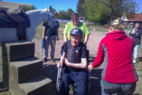 Endlich ging es los! Das Ziel war der Reitstall „Feel the Horse“ in Schlatkow. Dort wurden Herr Klaut und seine Begleitpersonen bereits erwartet. Nach einem herzlichen Empfang ging es weiter zur Begrüßung von Pferd „Monty“. Herr Klaut wurde mit Helm und Sicherheitsweste ausgestattet und konnte über die Aufstiegshilfe sicher und behutsam auf dem Rücken von „Monty“ Platz nehmen. Ein wirklich tolles und entspanntes Pferd, was diese Situation auch das erste Mal so erlebte - und dann noch in Begleitung von fremden Menschen und einem Sauerstoffgerät. Nach circa 30 Minuten und einem sichtbar sehr glücklichen Herrn Klaut war es genug für Pferd und Reiter. So stieg Herr Klaut mit Hilfe wieder sicher und behutsam ab. Er konnte es gar nicht glauben, dass er dies wirklich erlebt hatte und so wurde „Monty“ von seinem Reiter für seine sehr gute Leistung mit Leckerlis belohnt.