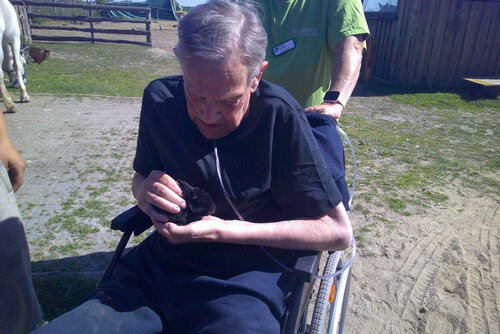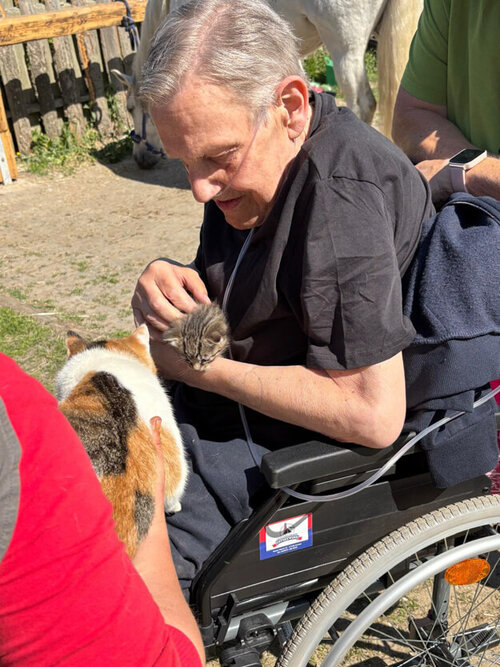 Im Anschluss gab es für alle eine Stärkung mit selbstgebackenen Muffins und heiteren Gesprächen. Dazu konnten noch ein Katzenbaby, Hasenbabys und ein Hund bewundert und gestreichelt werden. Die Hofbesitzerin und Pferdeheilpraktikerin Mandy Buschhagen wollte für dieses tolle Erlebnis keine Bezahlung. Die strahlenden Gesichter von Herrn Klaut und seinen Begleitpersonen waren ihr Lohn genug. Das wurde von allen sehr emotional aufgenommen.