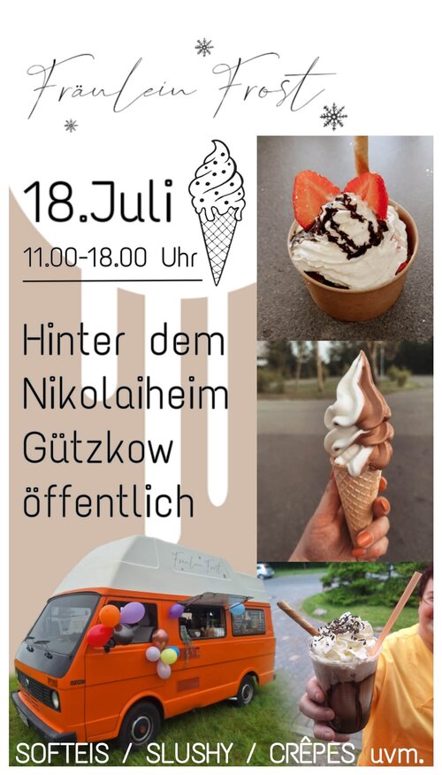 Was für eine schöne Überraschung, bei diesen sommerlichen Temperaturen! Am 18. Juli fuhr der Foodtruck von „Fräulein Frost“ im Gützkower Nikolaiheim vor und hatte allerlei Leckereien für die Mitarbeitenden und Bewohner*innen an Bord. Inhaberin Fiene Weißhoff stellte ihren Aufsteller neben das Fahrzeug und schon kamen die ersten neugierigen Kund*innen.