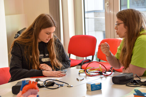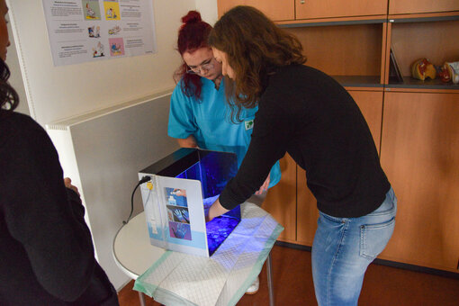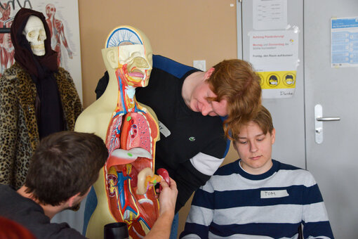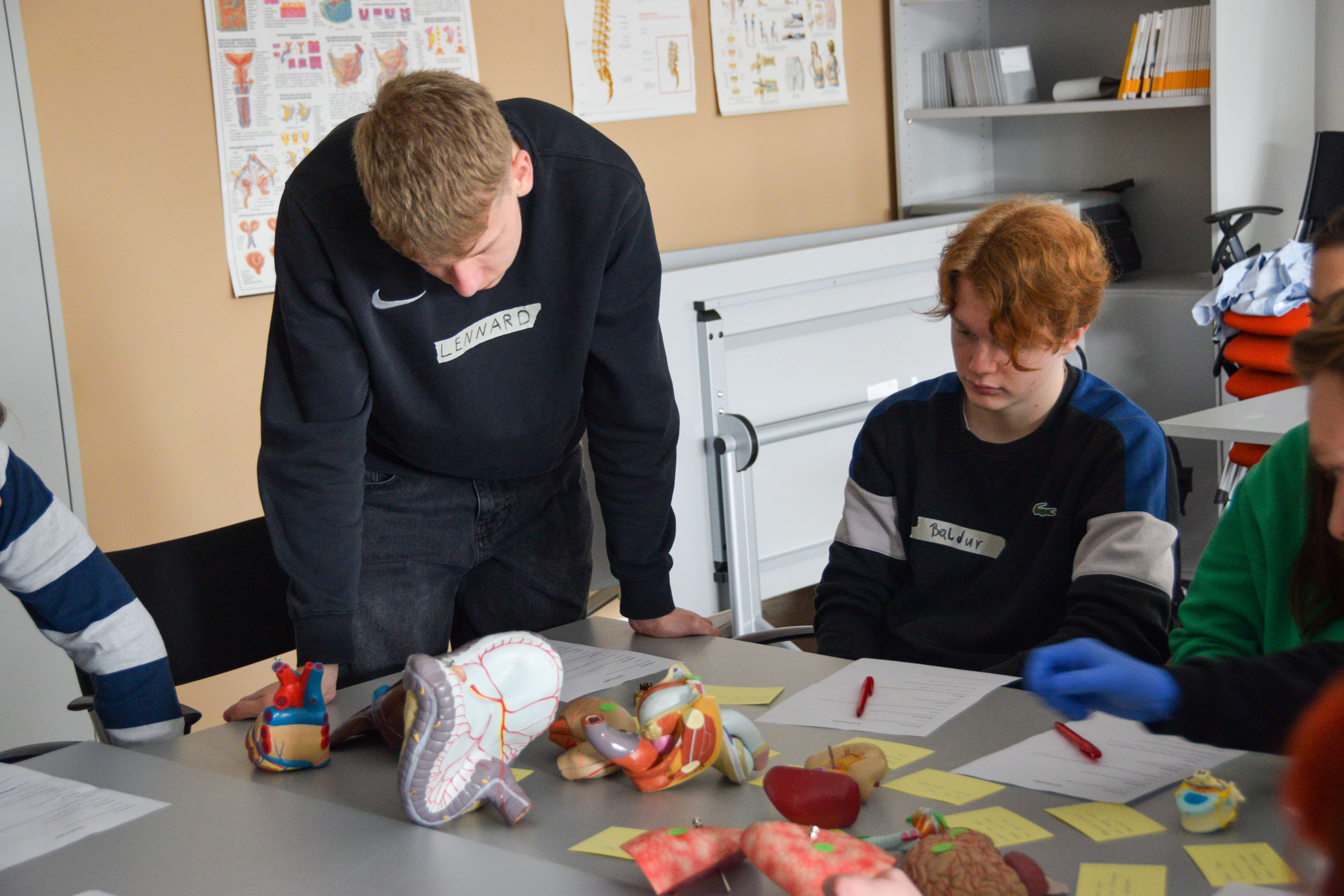 24 Schüler*innen des Regionalen Beruflichen Bildungszentrums Greifswald besuchten am 06.03. die Berufliche Schule, Fachbereich Gesundheit und Pflege. Die 12. Klasse des Fachgymnasiums mit dem Schwerpunkt Gesundheit hat an diesem Tag einen Einblick in die Pflegeausbildung erhalten. Nach einem kurzen Vortrag zur WA Nord und den Ausbildungsmöglichkeiten, nahmen die Auszubildenden des 3. Lehrjahres zum*r Pflegefachmann/Pflegefachfrau die Schüler*innen mit in die vorbereiteten Workshops. Die Auszubildenden hatten 4 verschiedene Stationen zum Ausprobieren, Anfassen und Mitmachen vorbereitet. So wurde auf die richtige Hygiene bei der Händedesinfektion geachtet, verschiedene Wirkstoffe in die Kategorien Medikament oder Betäubungsmittel eingeordnet, die Vitalwerte, wie z.B. den Puls gemessen und den Torso mit den inneren Organen bestimmt. In allen 4 Stationen waren kleine Fragen versteckt, die die Schüler*innen beantworten mussten. Am Ende hat eine Gruppe gewonnen und erhielt einen kleinen Preis. Wir bedanken uns bei Herrn Kohnert, dem BO-Lehrer am RBB und sehen vielleicht den ein oder anderen im September zum Schulstart als neue*n Auszubildende*n wieder.