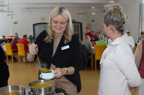Alle waren in den großen Saal eingeladen, wo ein leckeres Buffet der Züssower Service und Catering gGmbH auf die Kolleginnen und Kollegen wartete. Claudia Hübner, Regionalleitung des Nikolaiheims, freute sich über die rege Teilnahme und verriet, dass einige Mitarbeitende sogar trotz Urlaubs und chaotischer Straßenverhältnisse nach dem plötzlichen Wintereinbruch vorbeigekommen waren, um dem Teamevent beizuwohnen.
