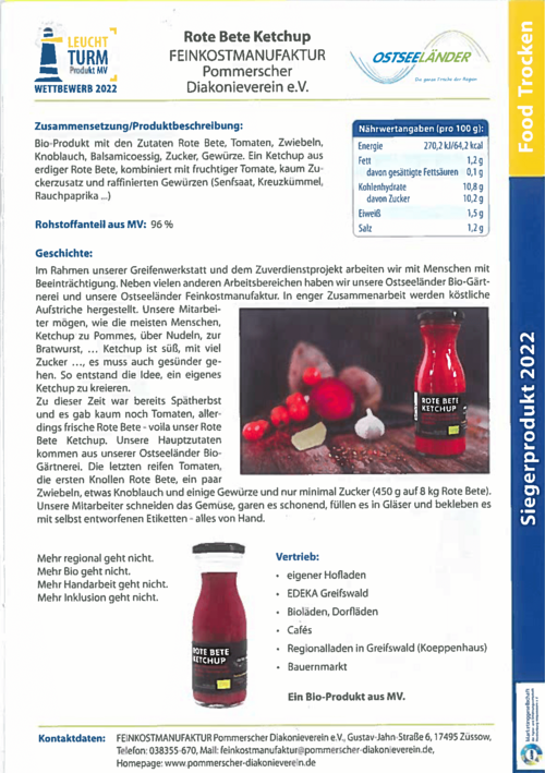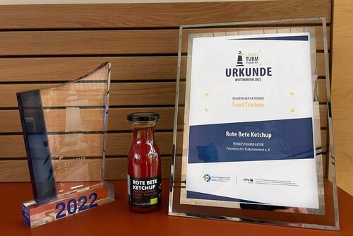 Die Jury wählte aus 54 Bewerber-Produkten und gab uns recht: Unser Rote Bete Ketchup ist ein Produkt-Leuchtturm MV 2022!