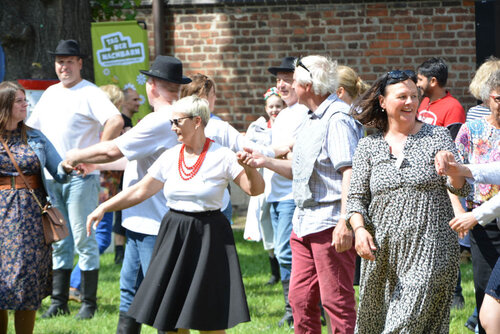 Schon der Auftakt war fulminant: Gleichzeitig hielten das Theater Vorpommern – in prächtigen Romeo-und-Julia-Kostümen – sowie die Folkloregrupp „Ina“ aus Greifswalds Partnerstadt Goleniów Einzug. Nebenbei übte der Kinderchor auf einer Picknickdecke noch mal für seinen Auftritt. Letzte Vorbereitungen an den Info-Ständen wurden getroffen und erste Kuchenstücke verzehrt.