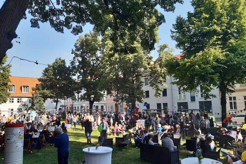 Abwechslungsreich und trubelig: So sollte es den ganzen Tag über bleiben. Neben dem Bühnenprogramm gab es zahlreiche interaktive Angebote für Klein und Groß. Aber vor allem gab es Gelegenheit zum gemütlichen Klönen mit der Nachbarschaft und zum Genießen einer einzigartigen Stimmung mit viel Lachen und Luftballons, Solidarität und Seifenblasen.