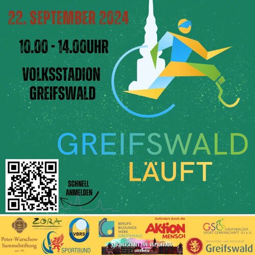 Unter dem Motto "Greifswald läuft" findet am 22.09.2024 | 10:00- 14:00 Uhr die erste inklusive Spendenlauf-Veranstaltung und gleichzeitig die Eröffnung der „Sportwoche für Alle“ im Volksstadion Greifswald statt. Initiiert wurde das Event durch die Universitäts- und Hansestadt Greifswald, die hiermit ein Zeichen für gleichberechtigte gesellschaftliche Teilhabe setzen möchte. Um diesen Ansatz auch rein praktisch zu fördern, sollen mit den erlaufenen Spendengeldern inklusive Projekte unterstützt werden.