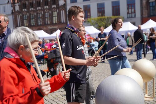 Highlight der Veranstaltung war die diesjährige Stadtwette. Wir haben gewettet, dass wir es schaffen 101 Personen (von 0 bis 100+ Jahre) vor unsere Bühne auf den Greifswalder Markt zu locken und mit uns gemeinsam zu Uptown Funk zu tanzen. Eine Choreographie wurde im Vorfeld mit der Tanzschule D&D erarbeitet und konnte auch noch am Markttag am Stand des Dienstes zur betrieblichen Inklusion geübt werden. DJ Thomas Wodrig motivierte viele Unentschlossenen im Verlauf des Tages nocheinmal an der Stadtwette teilzunehmen, so dass die Unternehmensgruppe Pommersche Diakonie um 16 Uhr sagen konnte: Tanzend, verbindend Energie erzeugt - Wette geschafft!