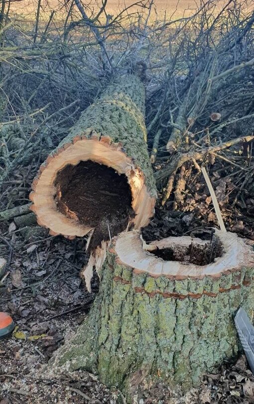 Mit Bäumen von beeindruckendem Durchmesser, 80 cm bis 1 m, stellten sie sich nicht nur der Aufgabe des Fällens, sondern mussten sogar einen Baum mit einem Traktor und einer Forstseilwinde ziehen, um sicherzustellen, dass er nicht in die falsche Richtung fiel.