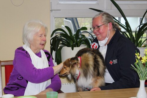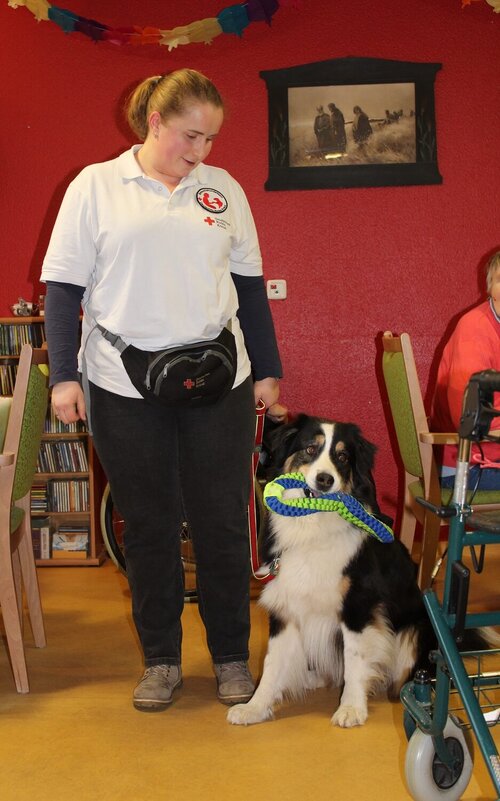 Hündin „Caja“ geht unterdessen mit Pflegedienstleitung Frau Voß und Besitzerin Martina auf eine besondere Mission. Da sie kleiner ist als die anderen beiden, besucht sie häufig Pflegebedürftige, die bettlägerig sind. Caja lässt sich ohne Einwände auf das Bett einer Bewohnerin setzen, legt sich hin und bleibt entspannt und geduldig liegen. Die besuchte Dame ist dement und ebenfalls kognitiv schwer beeinträchtigt. Sie kann sich nicht mehr mit Worten ausdrücken und schläft sehr viel. In Cajas Nähe öffnet sie für einen kurzen Moment die Augen und greift in das kuschelige lange Fell der Hündin. Caja lässt es geschehen, legt ihren Kopf auf die Bettdecke. Nach einer Weile im warmen Bett beginnt die Hündin leicht zu hecheln. Besitzerin Martina, die ein sensibles Gespür für ihr Tier hat, weiß: es ist Zeit für eine Pause. Nach ungefähr einer Stunde ist daher auch der Hundebesuch in der Einrichtung vorbei und die Vierbeiner werden mit kleinen Spielen im Freien und einem Spaziergang für ihre Arbeit belohnt.