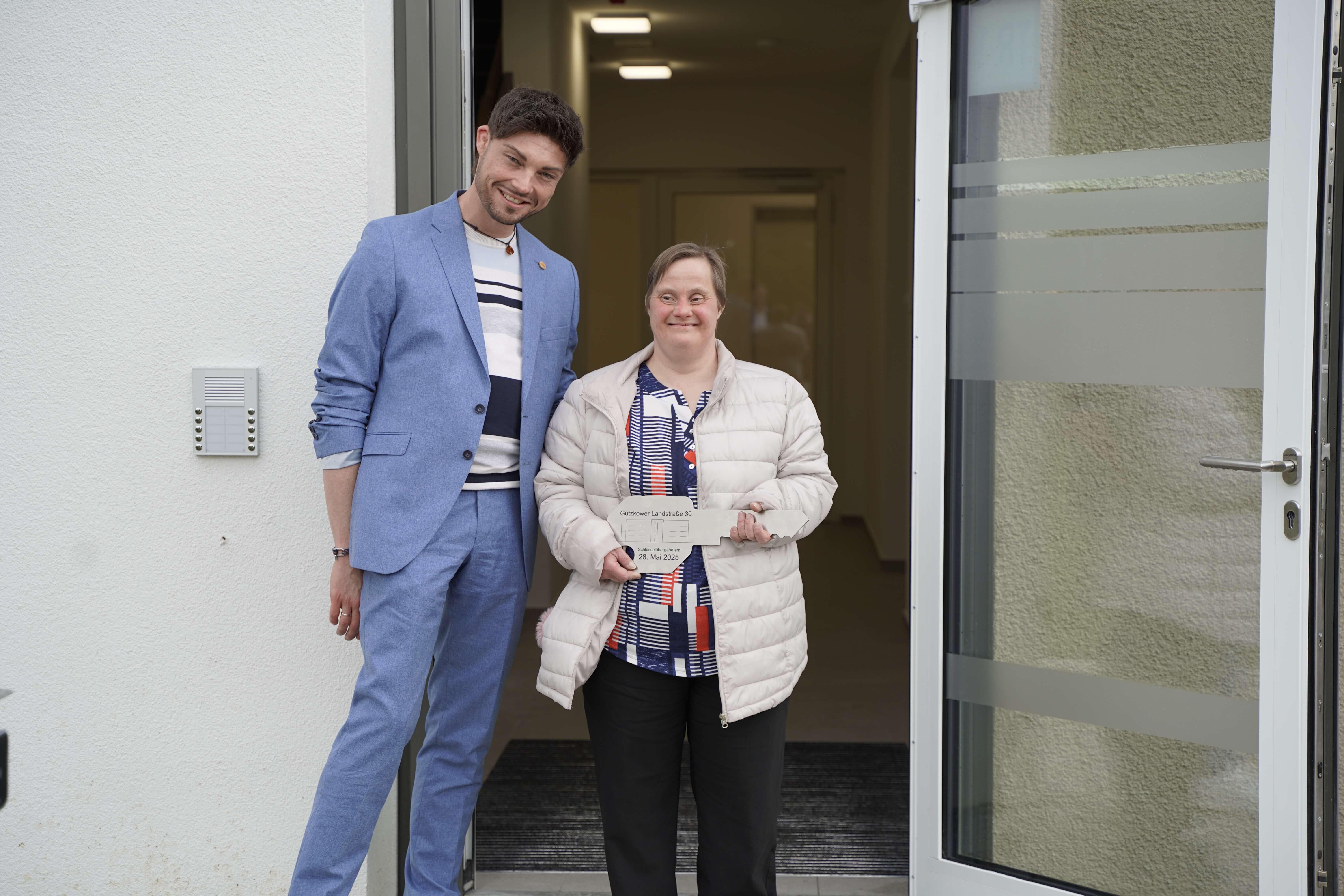 Einige der Zimmer werden in der kommenden Woche durch die jetzigen Bewohner*innen des Martinstifts bezogen. Dass das neue Haus in der Gützkower Landstraße namenlos bleiben wird, war dabei eine bewusste Entscheidung gewesen, um den inklusiven Charakter des Wohnangebotes zu unterstreichen. Und so steht der Übergang vom besonderen Namen des Hauses in der Steinstraße zu einer allgemeinen Adresse am neuen Standort auch ein Stück weit für die Normalisierung inklusiver Wohnangebote in der Nachbarschaft. Mit der symbolischen Schlüsselübergabe durch das Architekturbüro FMR Part mbB an eine der künftigen Bewohnerinnen wurde der Bezug des Hauses nun eingeläutet.