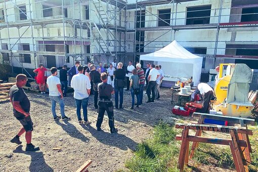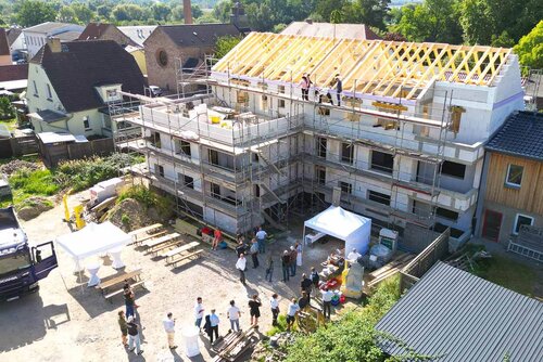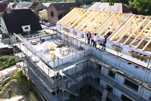 Im Zentrum von Damgarten errichtet der Pommersche Diakonieverein drei Mehrfamilienhäuser mit je acht Wohneinheiten in gehobener Ausstattung. Mit dem traditionellen Richtfest wurden am 07.09.23 die Fertigstellung des Rohbaus und die Einsetzung des Dachstuhls gefeiert. In einer kurzen Ansprache dankte Vorsteher Dr. Michael Bartels den beteiligten Gewerken, Planenden, Architekten und weiteren Gästen für den bisherigen Baufortschritt. Der zuständige Bauamtsleiter, Herr Körner, hob die Bedeutung des Baus für die Entwicklung des Damgartener Zentrums hervor. Es sei ein wichtiges Projekt für die Zukunft des Ortes und die Entwicklung von guten und zeitgemäßen Wohnmöglichkeiten - unweit der Küste. Anschließend wurde der Bau des Dachstuhls traditionell mit einigen letzten Hammerschlägen durch den Kaufmännischen Vorstand, Steffen Jaeckel, abgeschlossen. Der Zimmerermeister Herr Berger von der Firma Jantzen erinnerte daran, dass für jeden daneben gegangenen Hammerschlag eine Kiste Bier für die Zimmerer fällig sei. – Ob und wieviele Hammerschläge aber daneben gingen, blieb offen.
