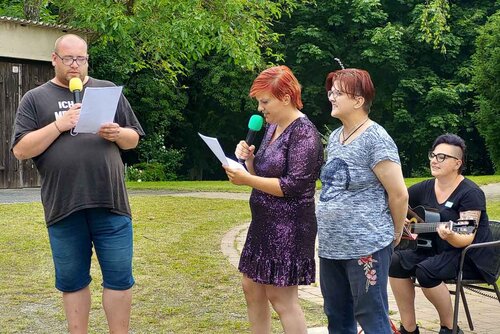So langsam ist zu erkennen, was das Ganze wird, denn es treffen die ersten Besucher ein. Familienangehörige, Freunde, Betreuer, ehemalige Mitarbeitende. Nun denn - das Sommerfest im Ernst–Moritz–Arndt-Heim kann starten. Nach der Begrüßung und Ansprache durch die Regionalleitung folgt das musikalische Event der Bewohnenden, das großen Anklang bei den Besuchern findet und zum Mitsingen einlädt. Selbstgemachte Burger und Ketwurst sorgen für das leibliche Wohl, Cocktails lassen die Wärme erträglicher werden und schmecken wunderbar. An einem Stand können Blumenstecker gebastelt werden. Zwischendurch werden das Glücksrad (natürlich mit Preisen) und die anderen Spiele genutzt.