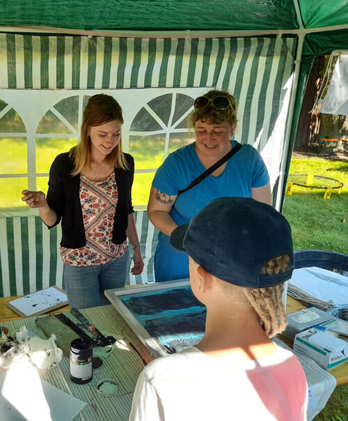 Die einzelnen Wohngruppen haben vielerlei Stände angeboten, an denen man sich die Zeit vertreiben konnte. So gab es unter anderem die Möglichkeit, mit Steinen, die die Wohngruppen "Am Ryck" selbst gesammelt hat, Bilder zu basteln. Und von der "Clearingstelle" in Greifswald gab es das Angebot, in einer Druckwerkstatt Beutel zu gestalten. Das "Jugendhilfezentrum Strelahaus" verschönerte unzählige Arme mit Glitzertattoos. Und bei der Wohngruppe "Janus" konnte man Bogenschießen zu lernen.