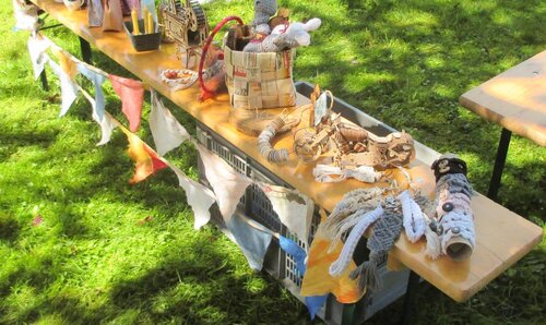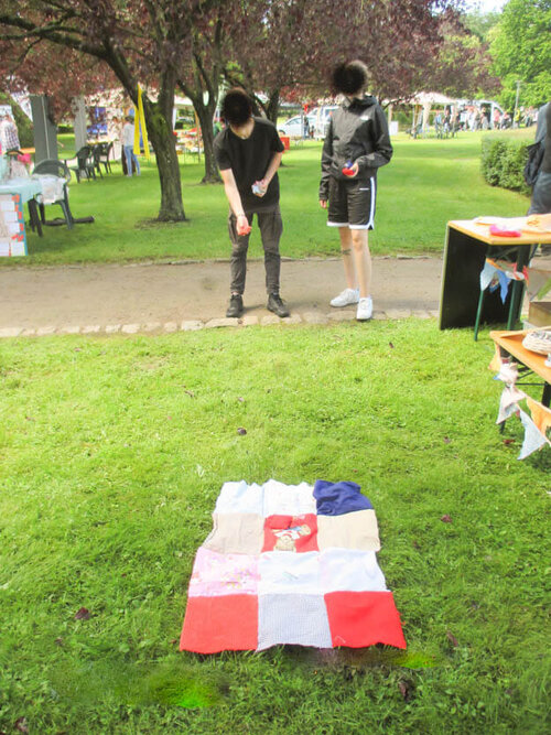Außerdem konnten sich Besucher:innen bei einem selbst gestalteten Wurfspiel ausprobieren - ein Upcycling Projekt der Trainingsmaßnahme. Auf einem Feld mit11 Kacheln durfte sich jeder in seiner Zielsicherheit versuchen und die farblich passenden Kirschkern-Säckchen auf die jeweiligen Kacheln werfen. Für den Hauptgewinn mussten alle 11 Kacheln getroffen werden