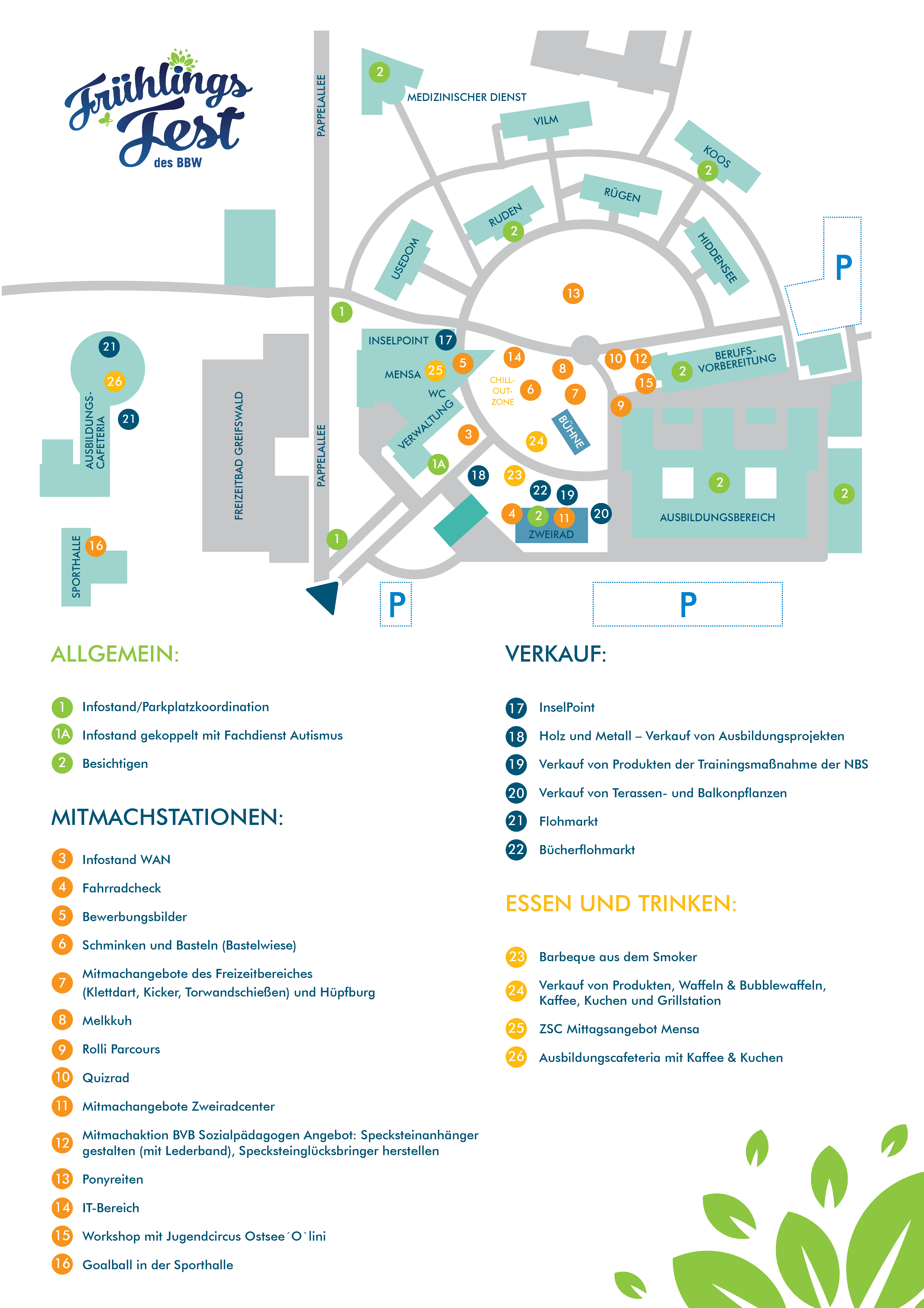 Mitmachaktionen laden die Besucher*innen ein, ihr Geschick zu zeigen – sei es beim Melken, Basteln oder Handwerken. Einzigartige Ausbildungsstücke aus unserer Metall- und Holzwerkstatt stehen zum Verkauf bereit, während Pflanzen aus unserer Ausbildungsgärtnerei darauf warten, Balkone und Gärten zu verschönern. Musikfans, Feinschmeckerinnen, Kunstliebhaberinnen und Sportinteressierte kommen gleichermaßen auf ihre Kosten. Auf der Bühne sorgt der Jugendcircus Ostsee 'O' Lini für Unterhaltung. Kinder können sich auf beliebte Attraktionen wie die Pony-Reitbahn und das Chaos Varieté freuen. Kinderschminken und Workshops mit dem Jugendcircus aus Stralsund runden das Programm ab. Für das leibliche Wohl sorgt das Team aus der Hauswirtschaft, der Lehrküche und der Züssower Service und Catering GmbH.