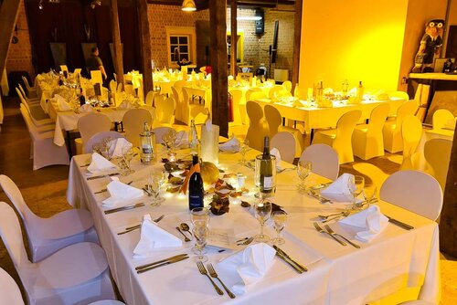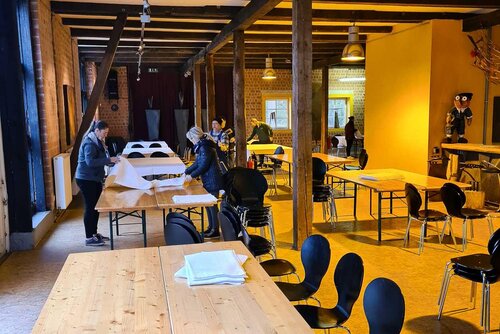 Das Team hat viel Erfahrung mit der Ausrichtung von Veranstaltungen und Catering im eigenen Haus. Nun stand es vor der Herausforderung, eine Veranstaltung an einem anderen Ort auf die Beine zu stellen, jenseits der vertrauten Räumlichkeiten und eingespielten Serviceabläufe in Züssow. Für eine festliche Veranstaltung im Skulpturenpark Katzow sollten Tafeln und Tischdeko aufgebaut und das Catering mit Bewirtung durchgeführt werden. Für 108 Gäste wurden Bestecke, Teller, Tischdecken, Gläser und vieles mehr benötigt, in Kisten verstaut und transportiert.