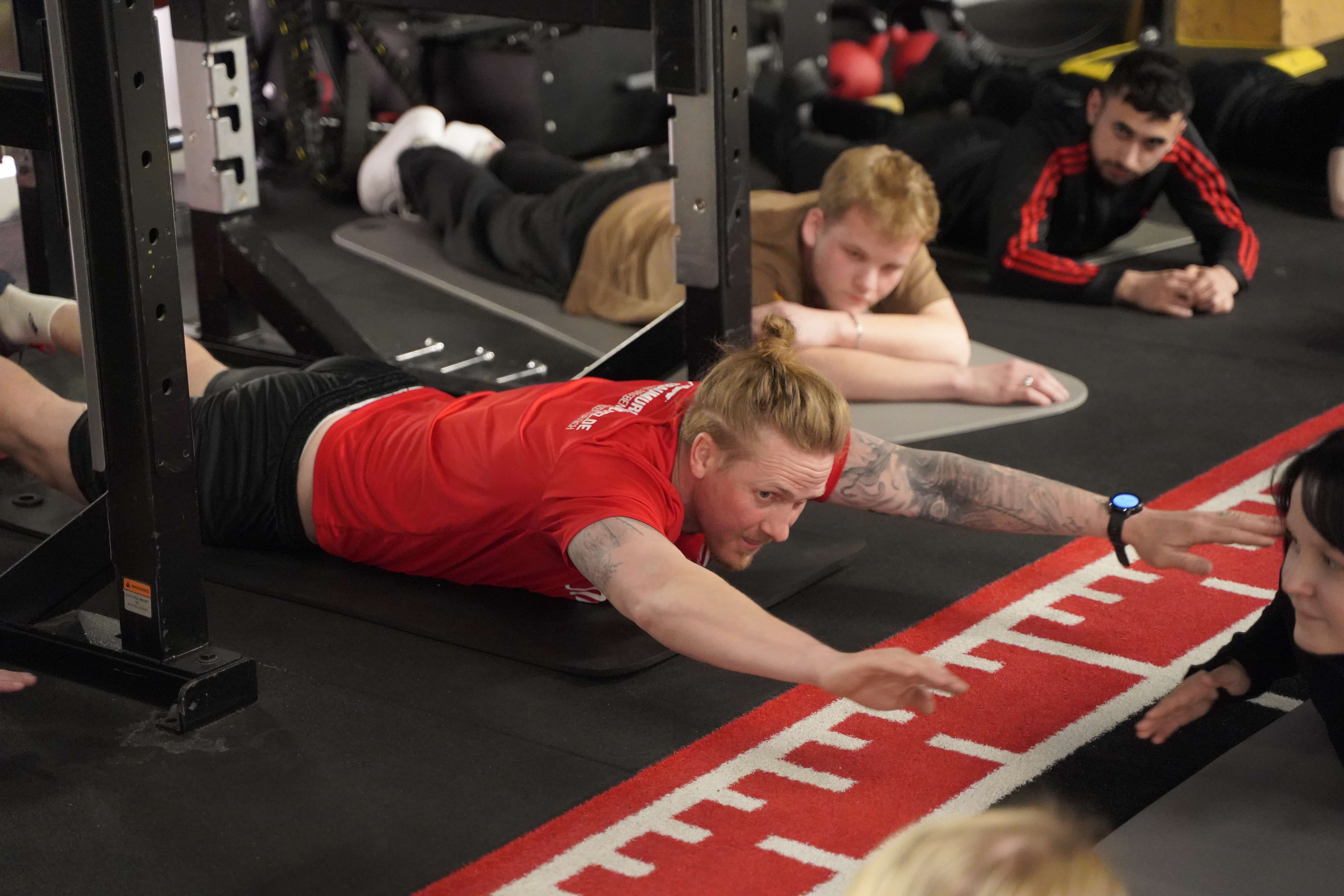 In drei Gruppen durchlaufen die Auszubildenen verschiedene Trainingseinheiten. Schwere Geräte dabei? Fehlanzeige. Im Fokus steht der eigene Körper. Hier sind Kraft, Ausdauer und Körperbeherrschung gefragt – und sämtliche Muskelgruppen, die einige wohl eher aus dem Anatomieunterricht kennen. An Grenzen stoßen, die ein oder andere auch überwinden. In erster Linie Kopfsache. Das ist eine wichtige Erfahrung, die die Auszubildenden hier sammeln.