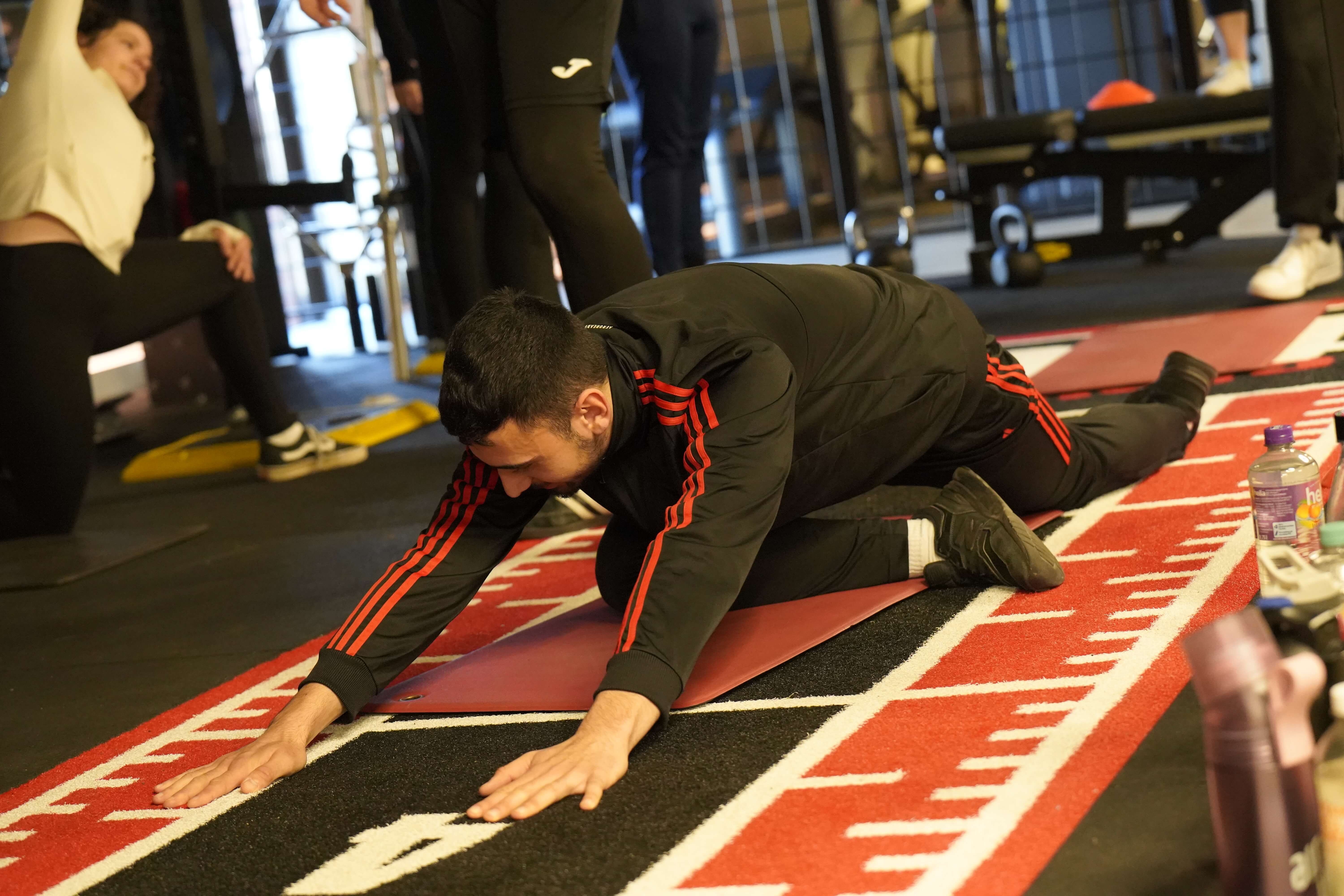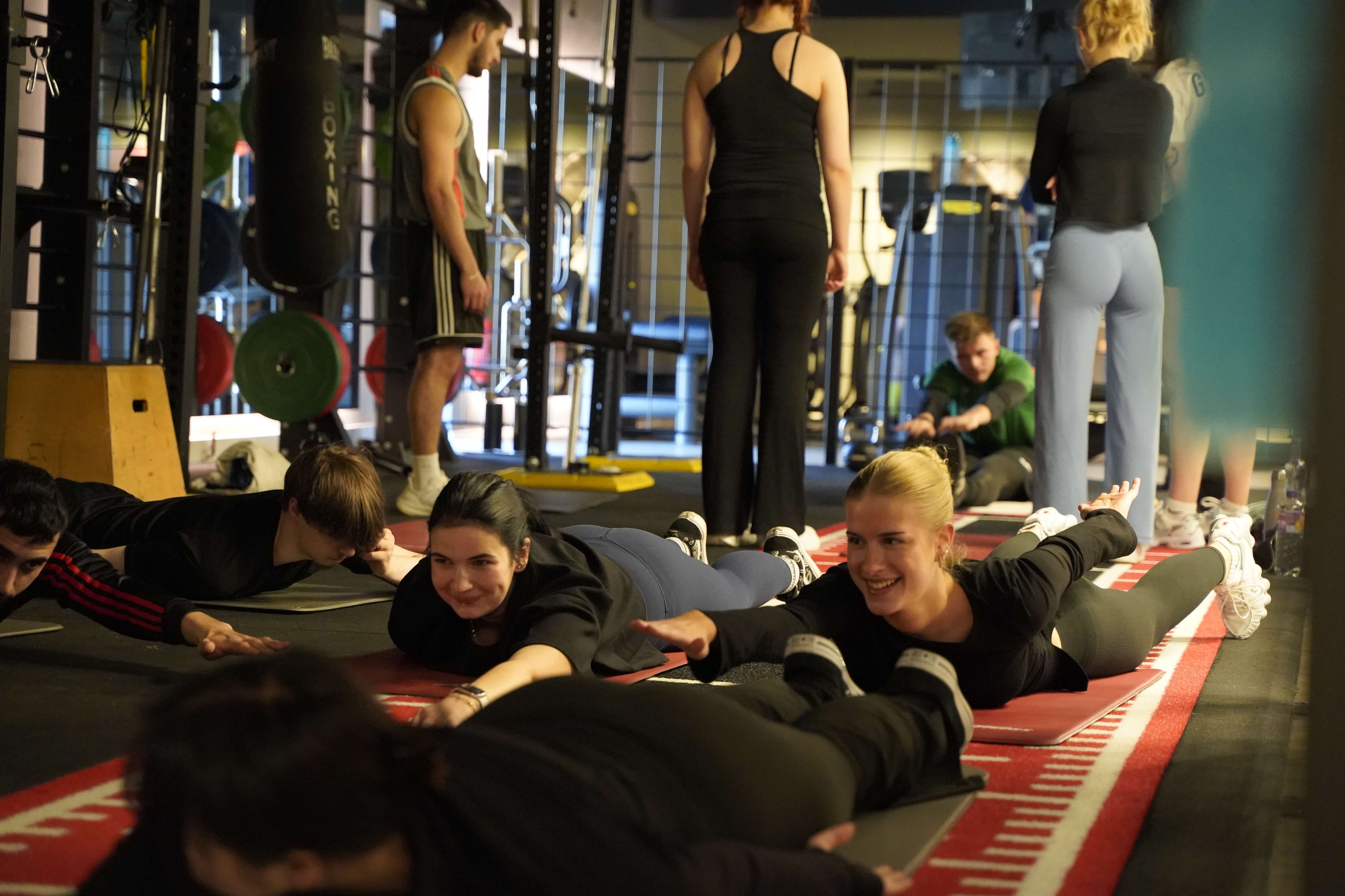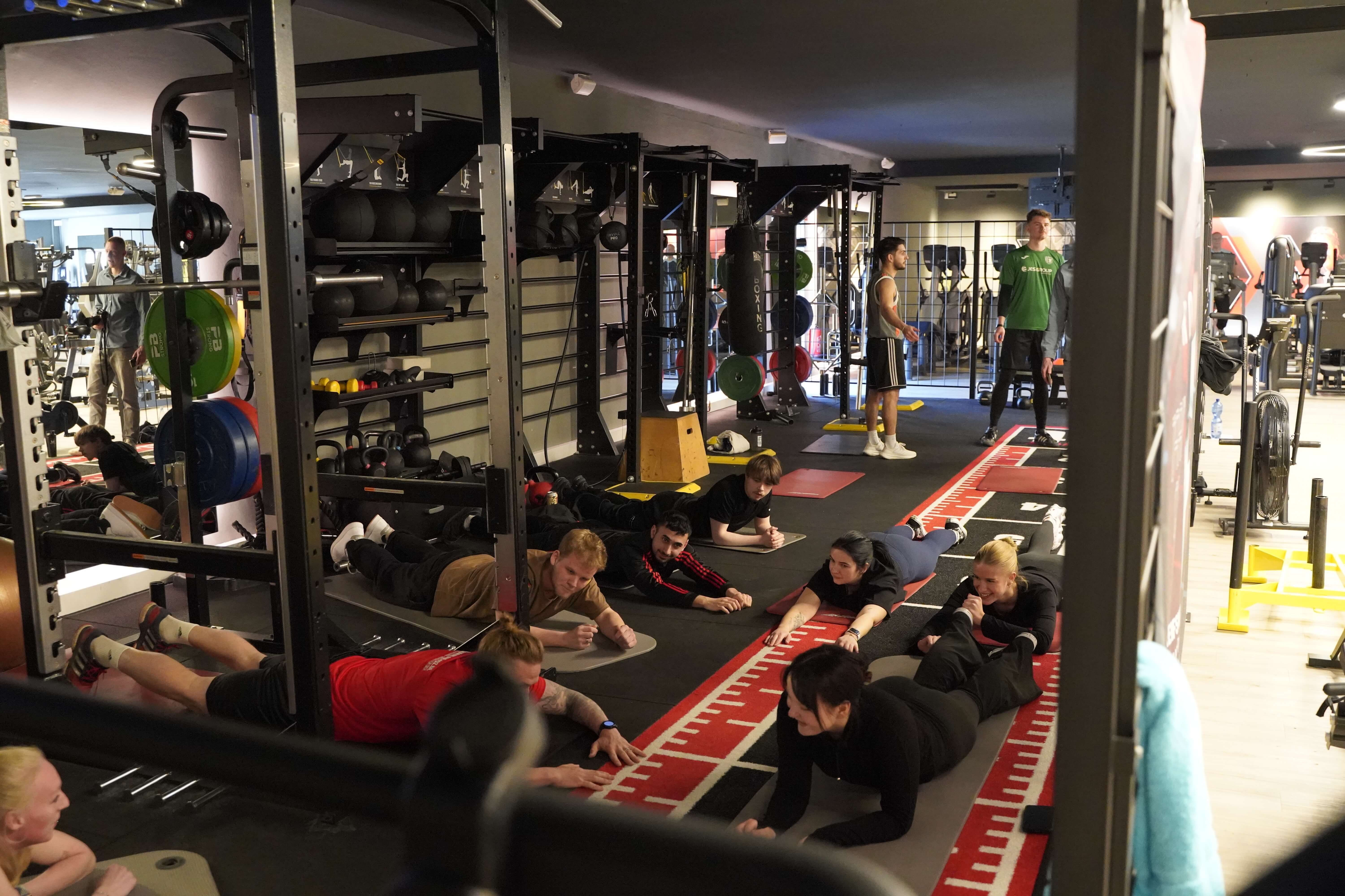 Die Zentralen Praxisanleiter Kathrin und Christoph nehmen die Auszubildenden vor der Tür des Fitnessstudios in Empfang. So richtig nach Move sieht hier draußen noch nichts aus. Doch dann öffnet sich die Tür. Eine lange Treppe führt nach oben und plötzlich wird ein wenig Aufregung, ein wenig Vorfreude, vielleicht auch ein wenig Unsicherheit spürbar, als die Gruppe die Schritte hinauf ins Studio geht. Trotz der frühen Uhrzeit sind bereits einige Sportler zum Trainieren da. Neugierige Blicke. Viele Fragezeichen. Was erwartet mich? Doch die Organisatoren holen die Auszubildenden mit einem kurzen Briefing ab. Ganz entspannt auf Augenhöhe und du und du. Dann geht es auch schon los.