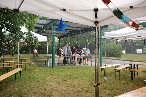 Trotz teils kräftiger Regenschauer zeigten alle Beteiligten, was Zusammenhalt bedeutet. Zelte wurden auf- und abgebaut, es wurde gegrillt, Blumen schmückten den Speisesaal, Bierbänke wurden trockengewischt, Kuchen vor dem Regen gerettet und natürlich wurde Musik gemacht und getanzt.
