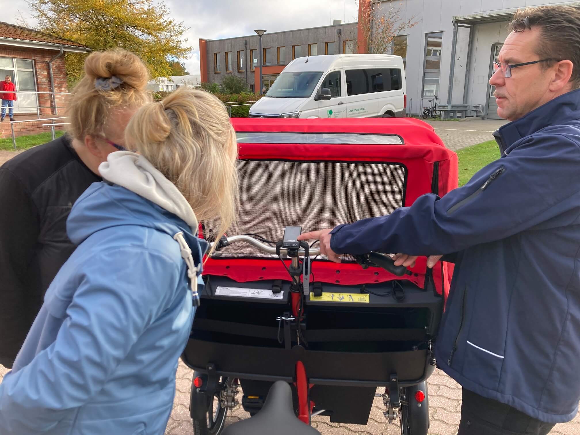 Mit großer Freude dürfen wir verkünden: Unsere neue Fahrradrikscha ist da! Nach Wochen der Vorfreude wurde das leuchtend feuerwehrrote Gefährt nun an die Tagesgruppe (Fördergruppe) des GB arbeiten in Züssow geliefert. Auf Anhieb war die Begeisterung groß.