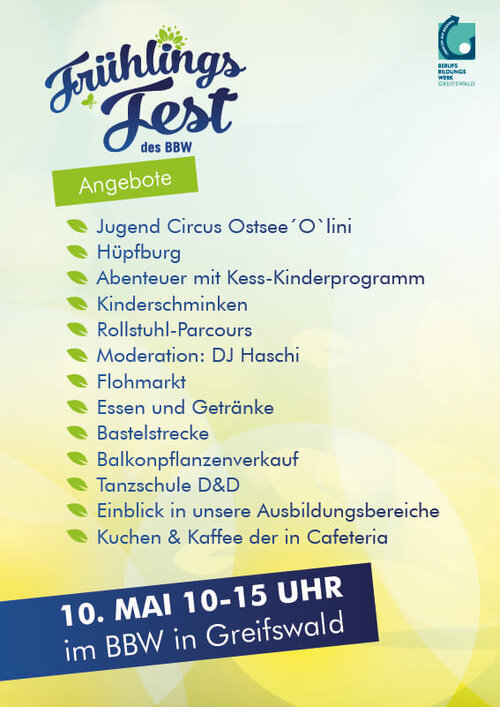 Das Frühlingsfest im BBW Greifswald verspricht einen Tag voller Freude, Unterhaltung und Einblicke in die vielfältigen Talente unserer Teilnehmer*innen. Sei dabei und erlebe die Vielfalt hautnah! Wir freuen uns auf dich!