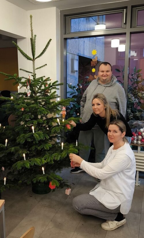 Heute Vormittag herrschte im Haus A des Geschäftsbereichs arbeiten des Pommerschen Diakonievereins in Züssow eine ganz besondere Stimmung. Die Tagesgruppe, die Hauswirtschaft und der Garten- und Landschaftsbau-Bereich kamen zusammen, um den Weihnachtsbaum festlich zu schmücken. Schon beim Betreten des Raumes war die Vorfreude spürbar, überall lagen glänzende Kugeln, funkelnde Sterne und bunte Schleifen bereit.