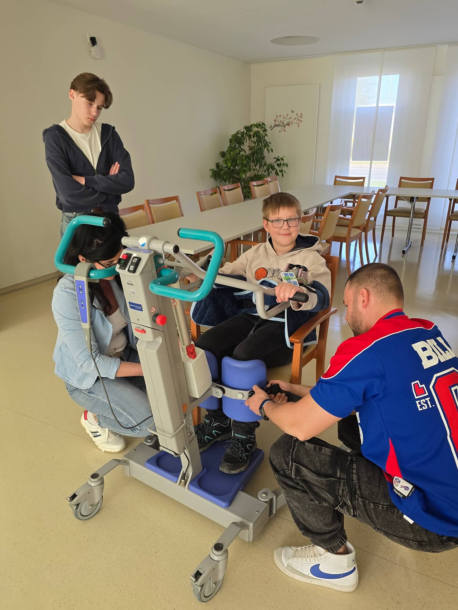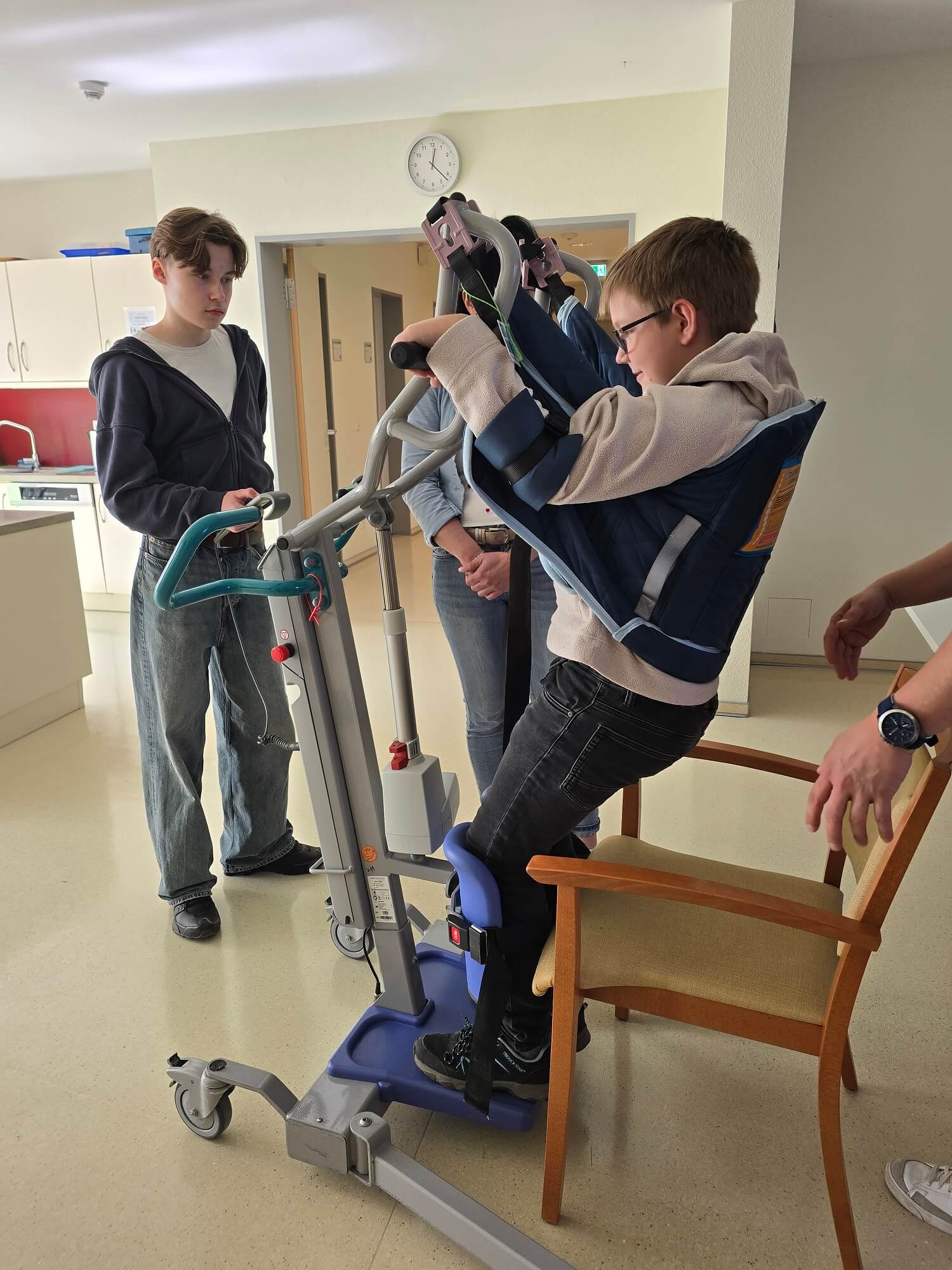 Jede*r durfte dieses Hilfsmittel testen – sowohl in der Bedienung, als auch aus der Perspektive einer*s Pflegebedürftigen. Schnell war die Erkenntnis da, dass körperliche Einschränkungen den Alltag wirklich erschweren und wie wichtig es ist, Unterstützung und Hilfestellung durch andere zu erhalten, die z.B. eine Hand reichen und Sicherheit vermitteln.