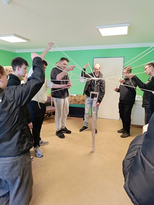 Nach dem theoretischen Teil stellte sich unser Zentraler Praxisanleiter, Herr Küthe, vor und erläuterte die essentielle Bedeutung von Teamarbeit im Pflegeberuf. Sogleich wurde diese hautnah gemeinsam erprobt beim Bauen eines „Fröbelturms“. Damit dieser gelingen konnte, waren vor allem Kommunikation und ein gemeinsames Ziel notwendig.