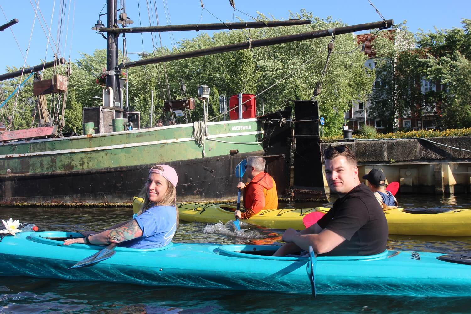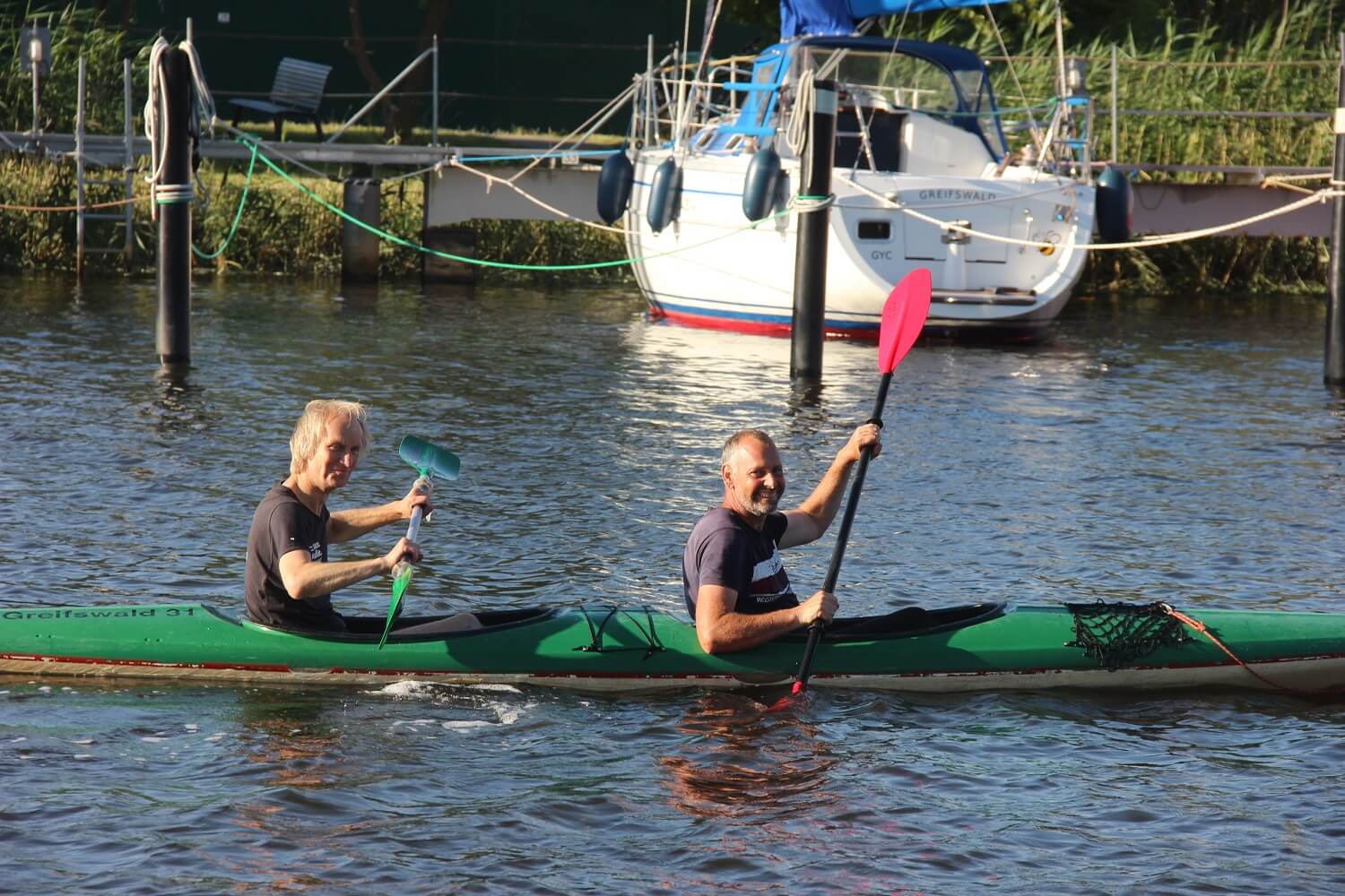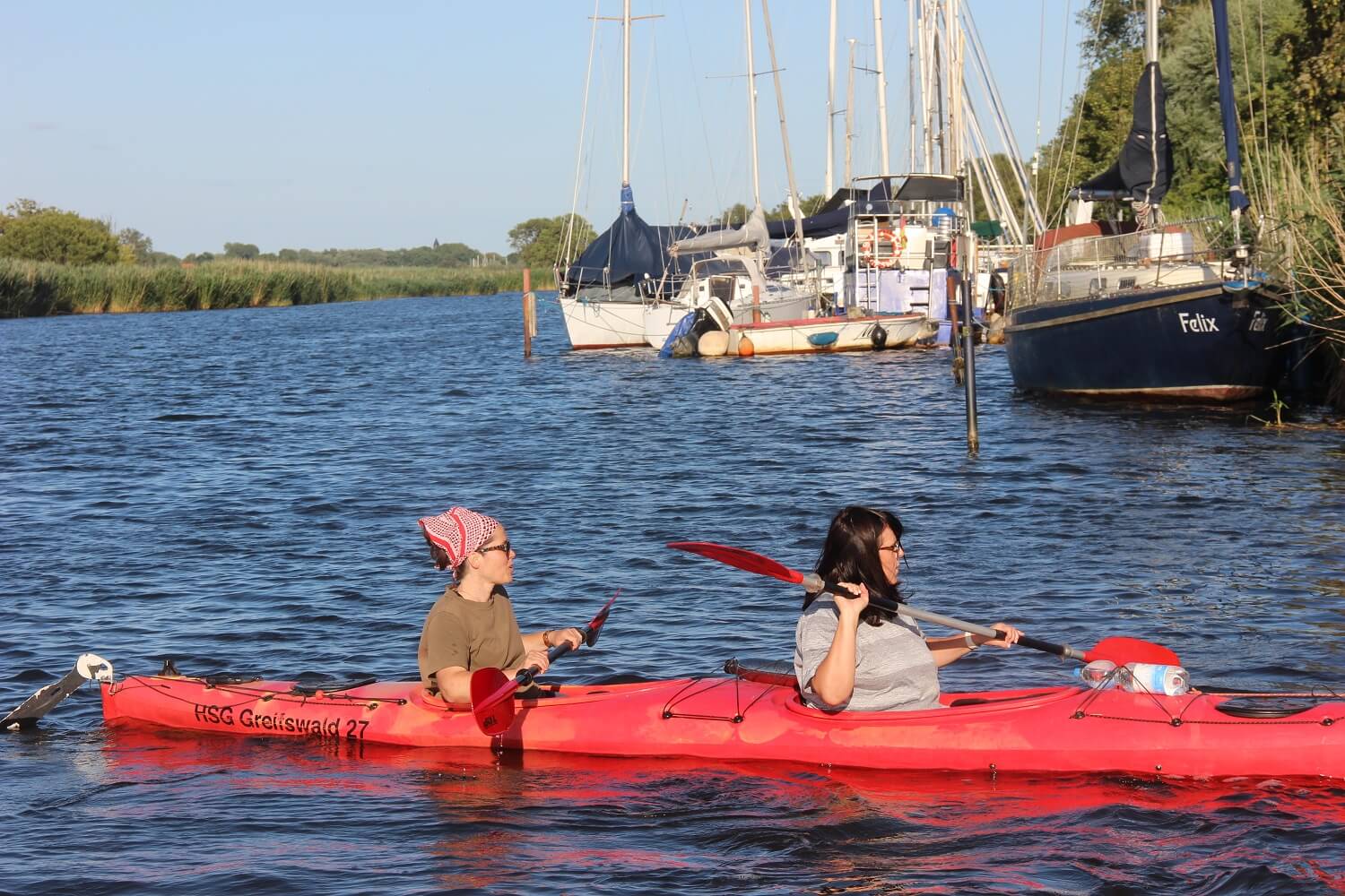 Begleitet von Herrn Mahlitz, IGT Partnerschaft mit dem GB arbeiten, erhielten alle zu Beginn eine kurze Einweisung in die Paddeltechnik und Einstellen der Boote. Anschließend ging es in Zweier-Kajaks aufs Wasser. Die Route führte vorbei an grünen Ufern, historischen Gebäuden und bot einen einmaligen Blick auf die maritime Seite Greifswalds. Die Tour bot genügend Momente zu Gesprächen im Boot, Feilen an der Paddeltechnik, denn nicht allen Teilnehmern/innen gelang es das Kajak auf geraden Kurs zu halten. Zum Teil kollidierten wir anfangs mehr mit der Uferböschung und pflügten den Ryckuntergrund dermaßen auf, dass uns die Seerosen und Algen um die Ohren flogen.