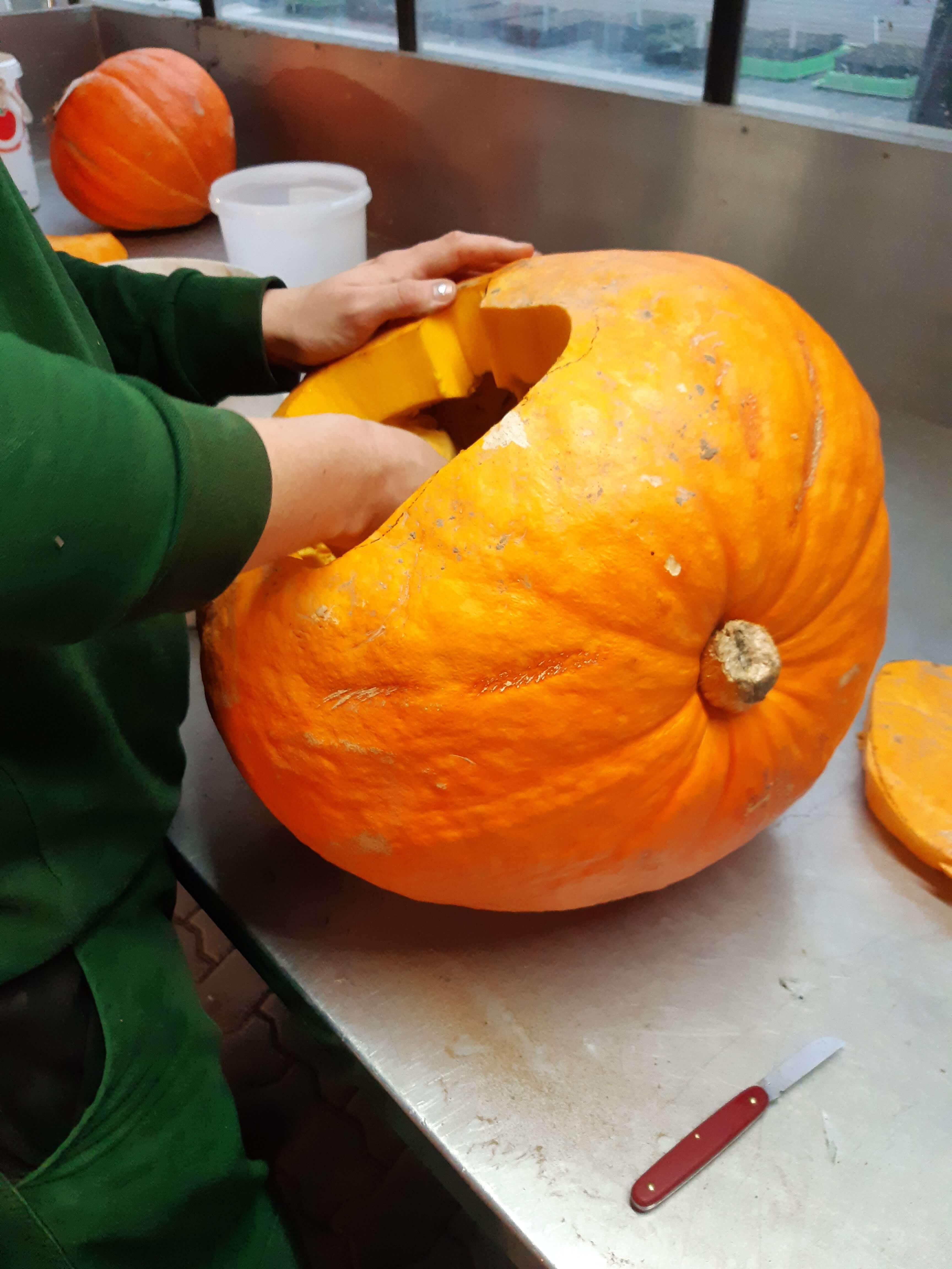 Hier wurde dann auch nicht gebacken oder gekocht, sondern geschnitzt. Ausgehöhlte Kürbisse, viel Fantasie und eine Prise Teamgeist sorgten für das perfekte Halloween-Feeling! Von gruseligen bis lustigen Kürbissen war alles dabei.