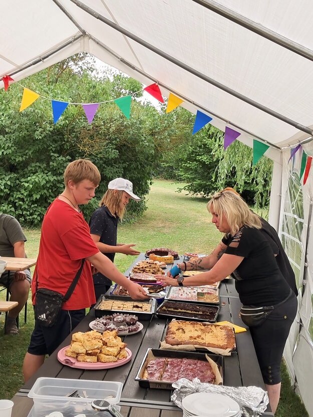 Liebevoll wurde alles vorbereitet und um 14 Uhr viel dass endlich der Startschuss. Die Auswahl fiel bei den unzähligen Angeboten, die sich die Wohngruppen überlegt haben, schwer. Zuerst Bogenschießen oder Glitzer-Tattoos oder doch lieber erst zum reichhaltigen Kuchenbuffet? Schwierige Entscheidungen waren da zu treffen.
