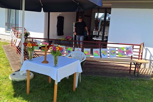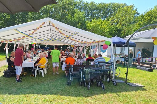 Unsere Mitarbeitenden waren vorab sehr fleißig und schmückten die Außenanlage mit Blumen, Girlanden, Luftballons und bunten Bildern. Es wurde ein großes Festzelt aufgestellt, sodass sich an diesem Tag alle über ein schattiges Plätzchen freuen konnten.