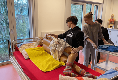 Ziel dieser Tage war es, den Auszubildenden des 1. Lehrjahres erste praktische Erfahrungen zu ermöglichen und diese mit dem bereits erworbenen theoretischen Wissen zu verbinden. Im Mittelpunkt standen die Themen Körperpflege und Mobilisation von Pflegeempfänger*innen. Begleitet wurden die Auszubildenden von erfahrenen Praxisanleiter*innen unserer Kooperationspartner.