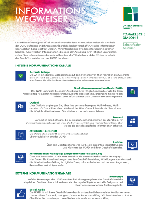 Der Informationswegweiser soll dir die verschiedenen Kommunikationskanäle innerhalb der UGPD aufzeigen und dir einen Überblick darüber verschaffen, welche Informationen über welchen Kanal gestreut werden. Wir unterscheiden zwischen internen und externen Kanälen. Also zwischen Informationen, die dich in der Ausübung deiner Tätigkeit unterstützen sollen. Und Informationen, die nach außen über die Tätigkeiten und das Wirken innerhalb der Geschäftsbereiche und der UGPD berichten.